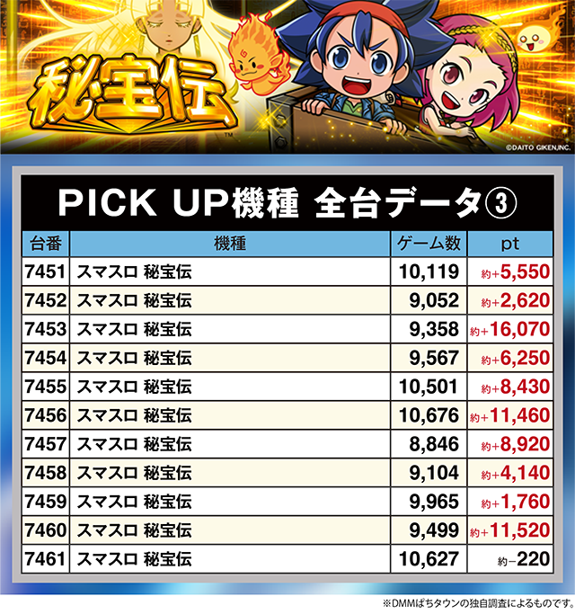 「スマスロ 秘宝伝」の7453番台や7460番台なども約+11,000pt以上となった。