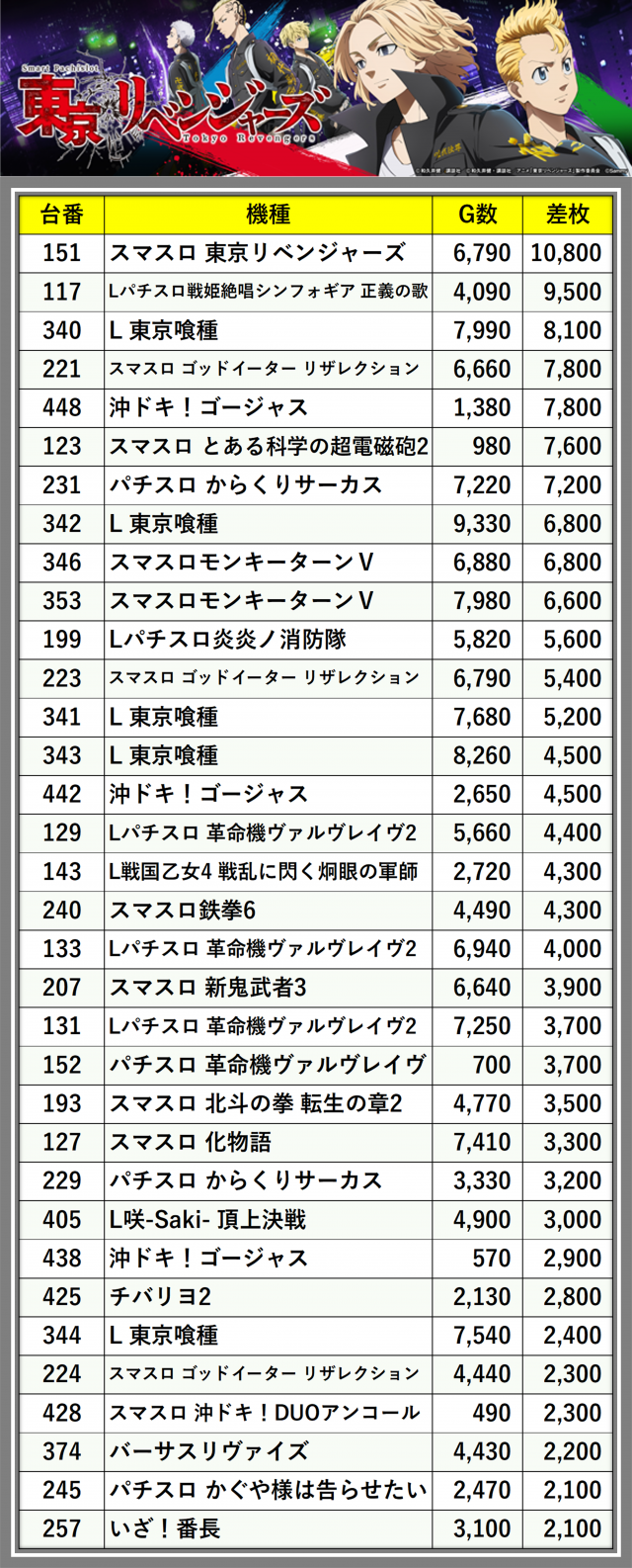 差枚数順に掲載しています