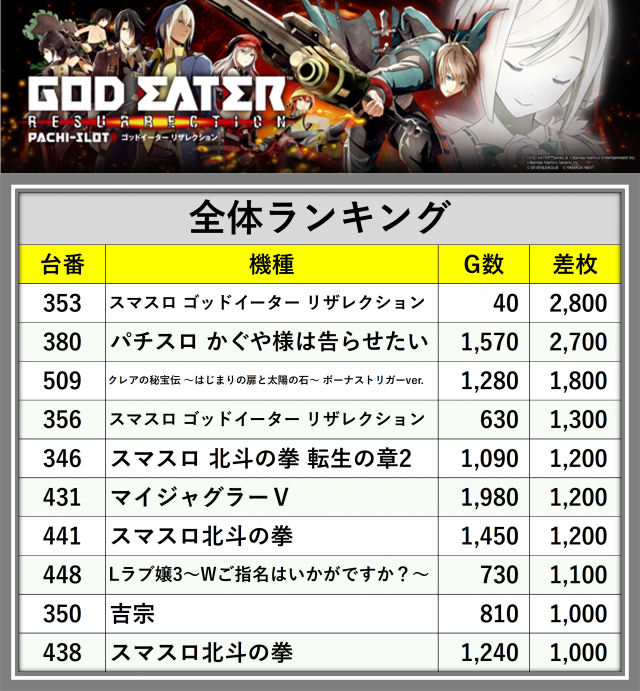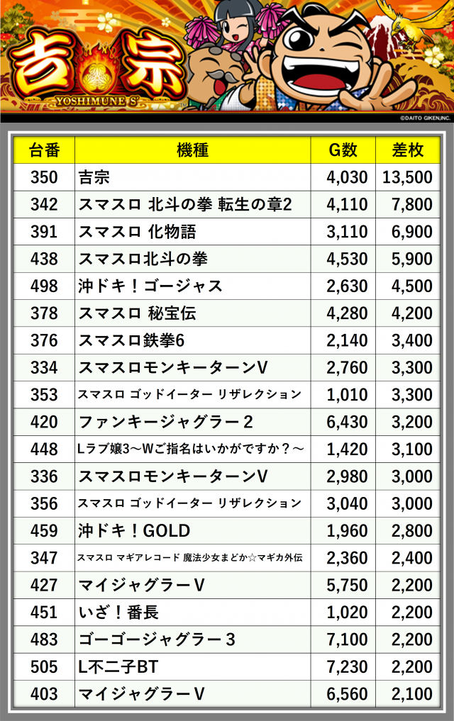 厳選された取材対象機種をはじめ、その他スロット全体から好記録が飛び出した!プレイヤーが楽しんだ1日を下記データにて振り返ってみて欲しい。