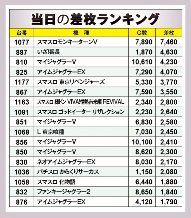 『スマスロモンキーターンV』にて7,460枚と大台突破が飛び出しており、店内の盛り上がりをリードする存在となっていた。また『いざ!番長』も負けじと4,630枚で追随し、他機種も活気あふれる状況で賑わっていたのも見逃せない。そして『マイジャグラーⅤ』では万回転を超える数字をマークしていることから、同機種がいかにポテンシャルを秘めていたのかが窺えるばかり。差枚数も比例するかのように伸びており、ファンはレバーオンに力が入っていたことだろう。