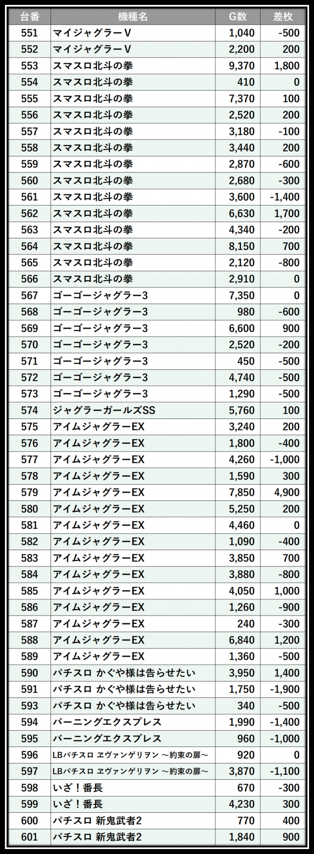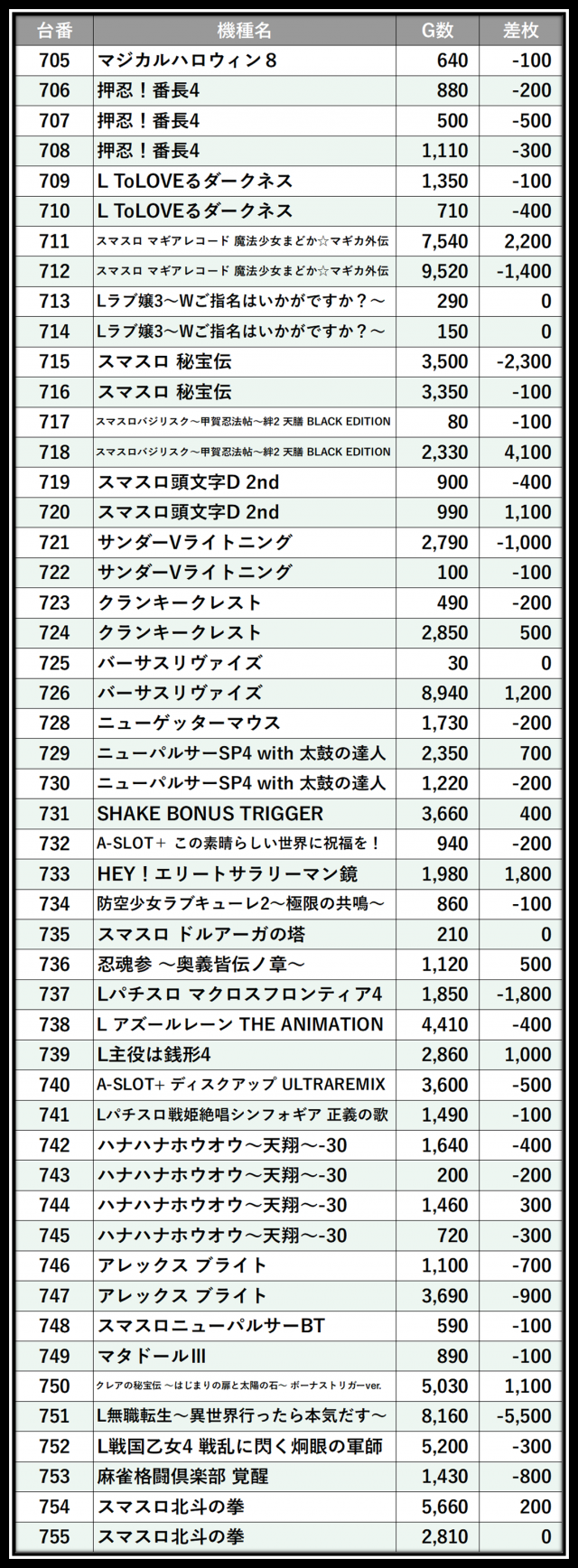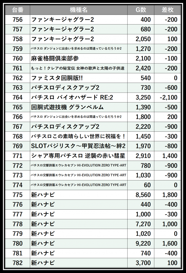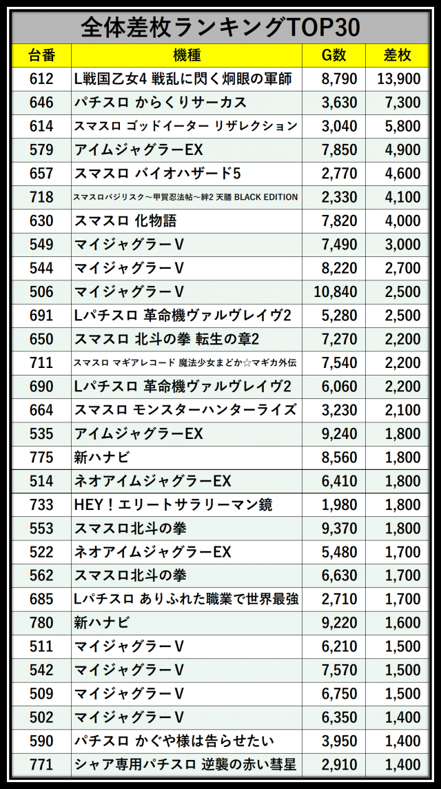 ※差枚数順に掲載しています