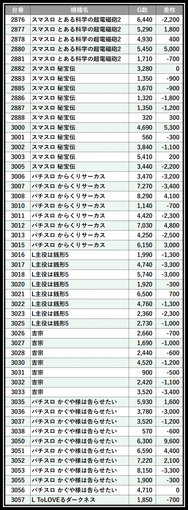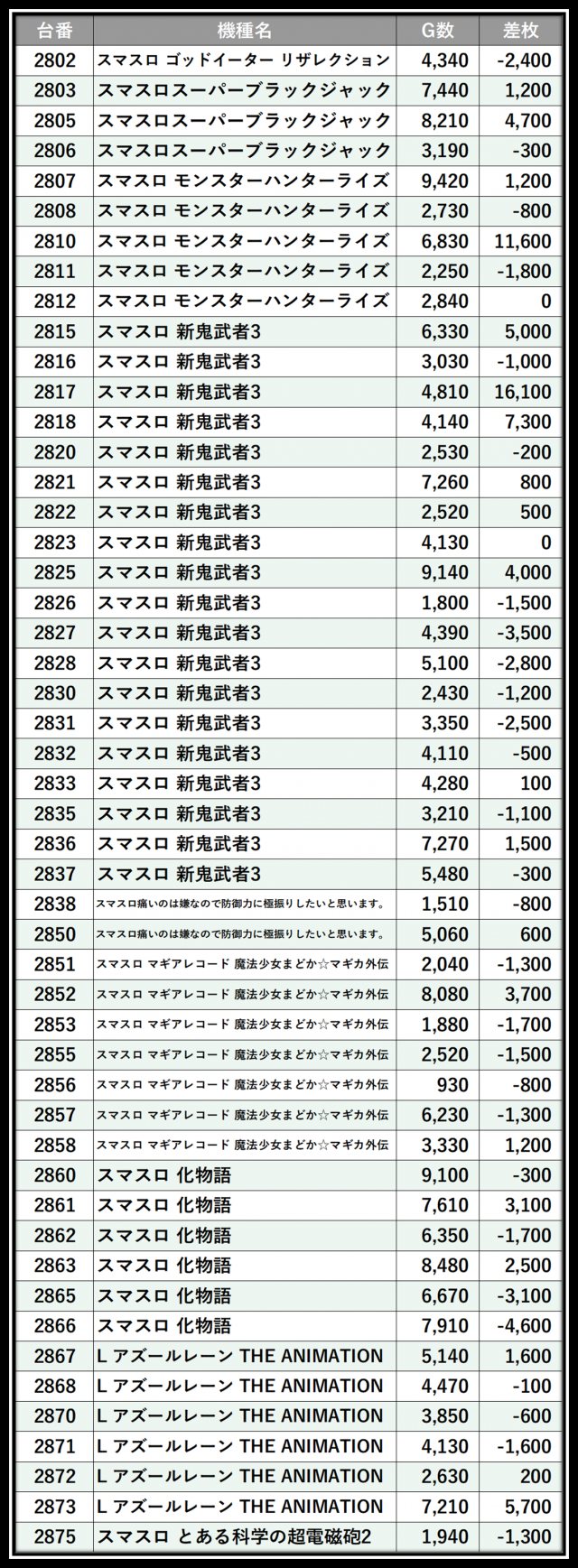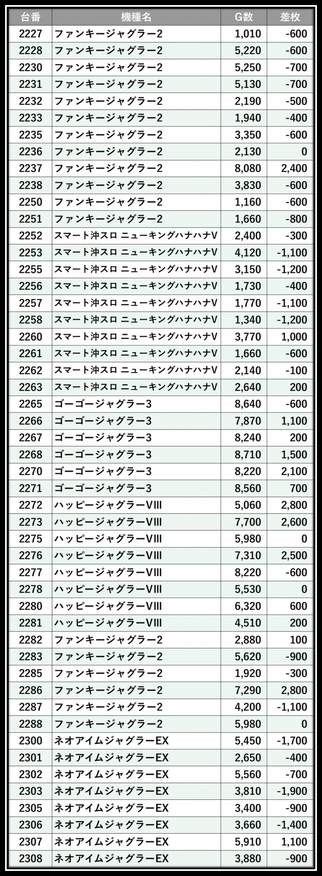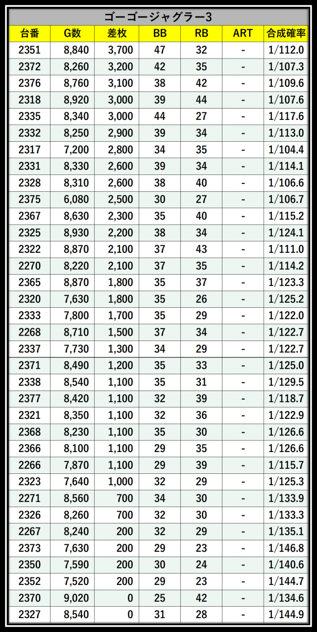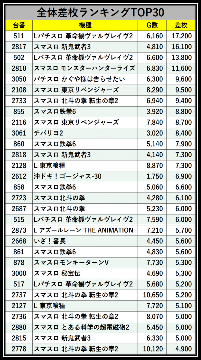 ※差枚数順に掲載しています