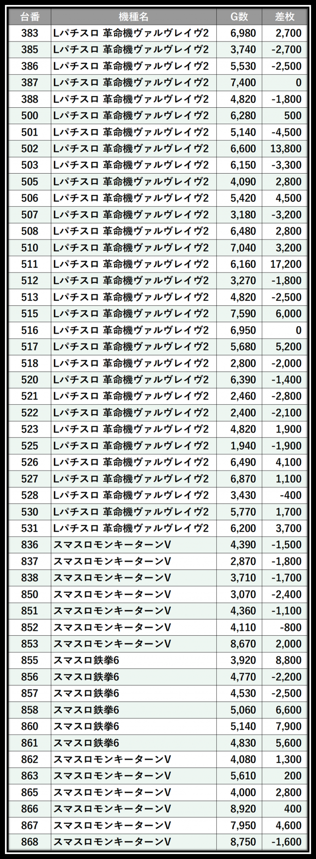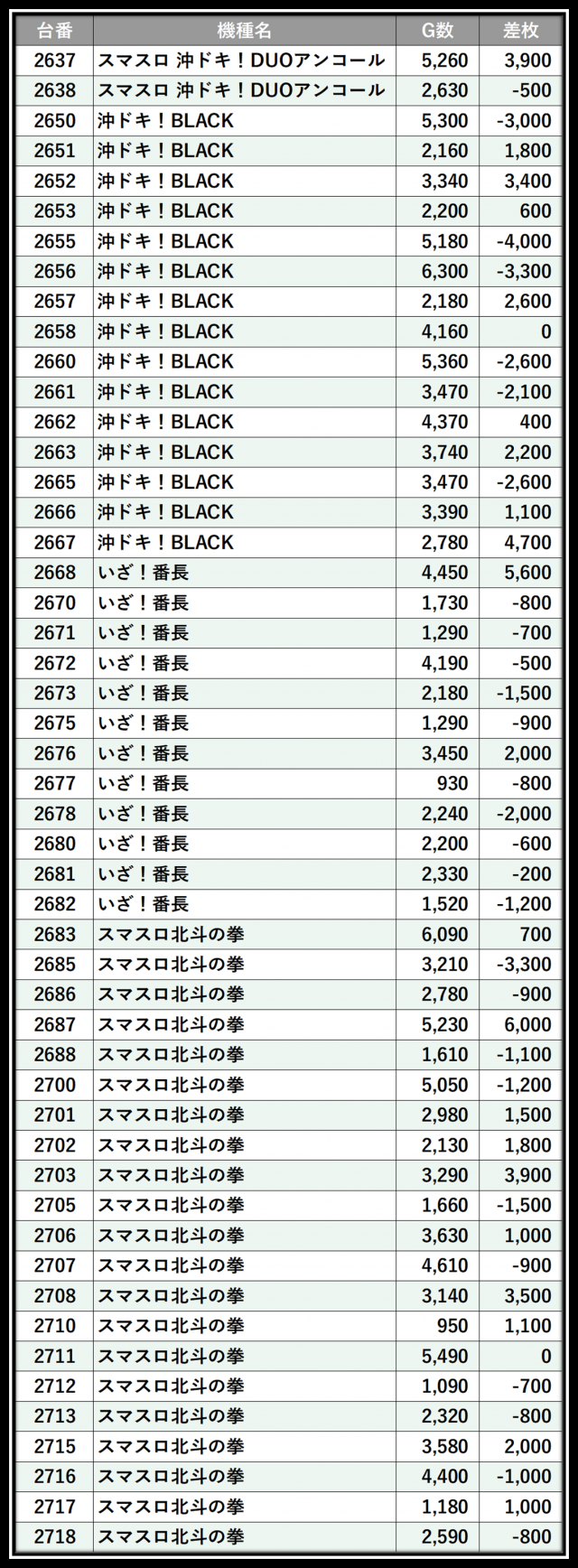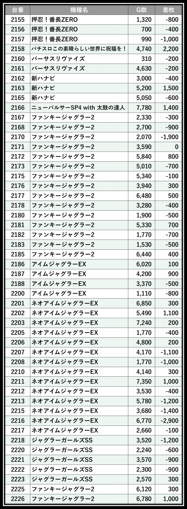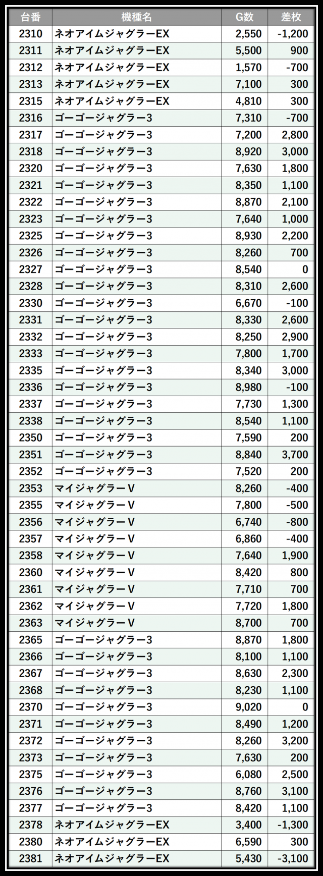 ※差枚数順に掲載しています