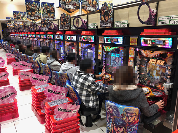 17時を過ぎたころの4円パチンコを見ると、「ぱちんこCR真・北斗無双」と「ぱちんこCR北斗の拳7 転生」が大盛況。稼働率も高く、機種のポテンシャルを上手く引き出しているプレイヤーが多数見られた。