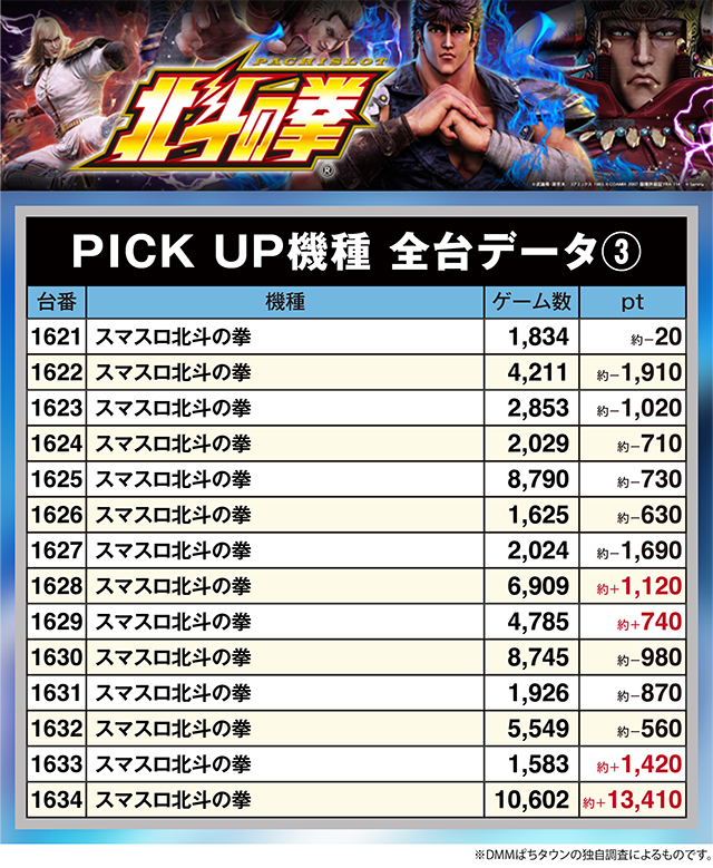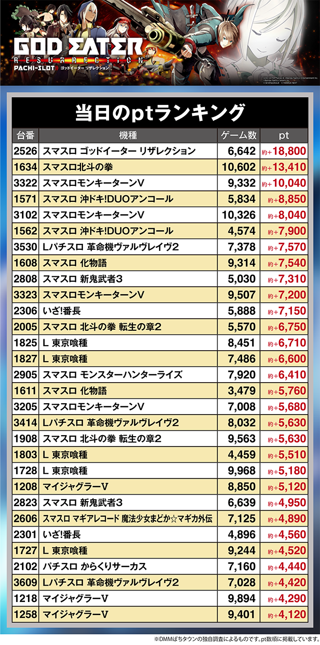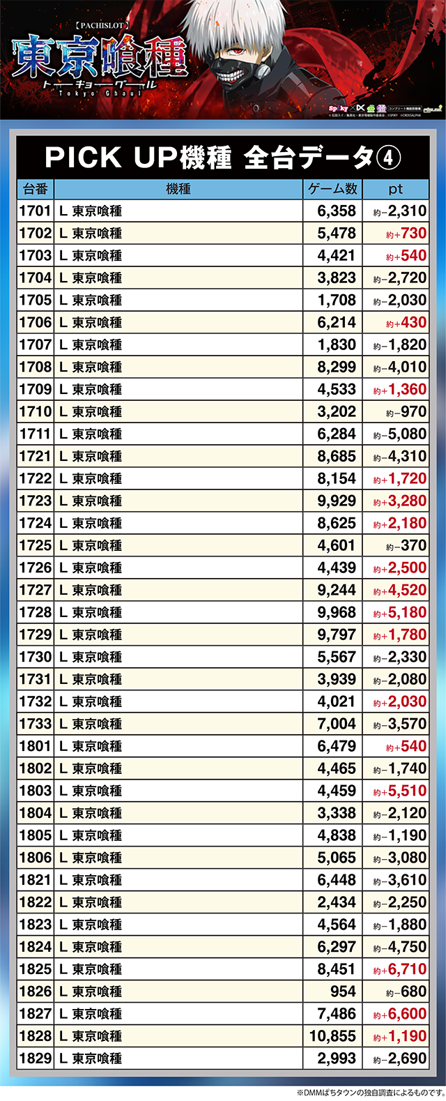 「スマスロ 北斗の拳 転生の章2」の1908番台や「L 東京喰種」の1728番台なども約+5,000pt以上と、多くの台が結果を残した。