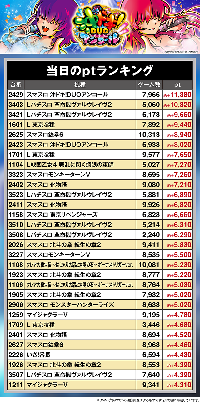 「スマスロ 沖ドキ!DUOアンコール」の2429番台が約+11,000ptオーバー!!