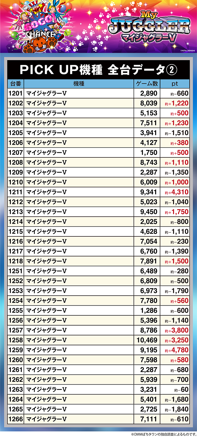「マイジャグラーⅤ」では、1211番台と1259番台が約+4,300ptオーバー!