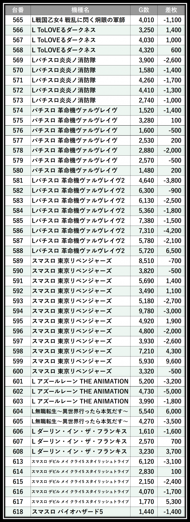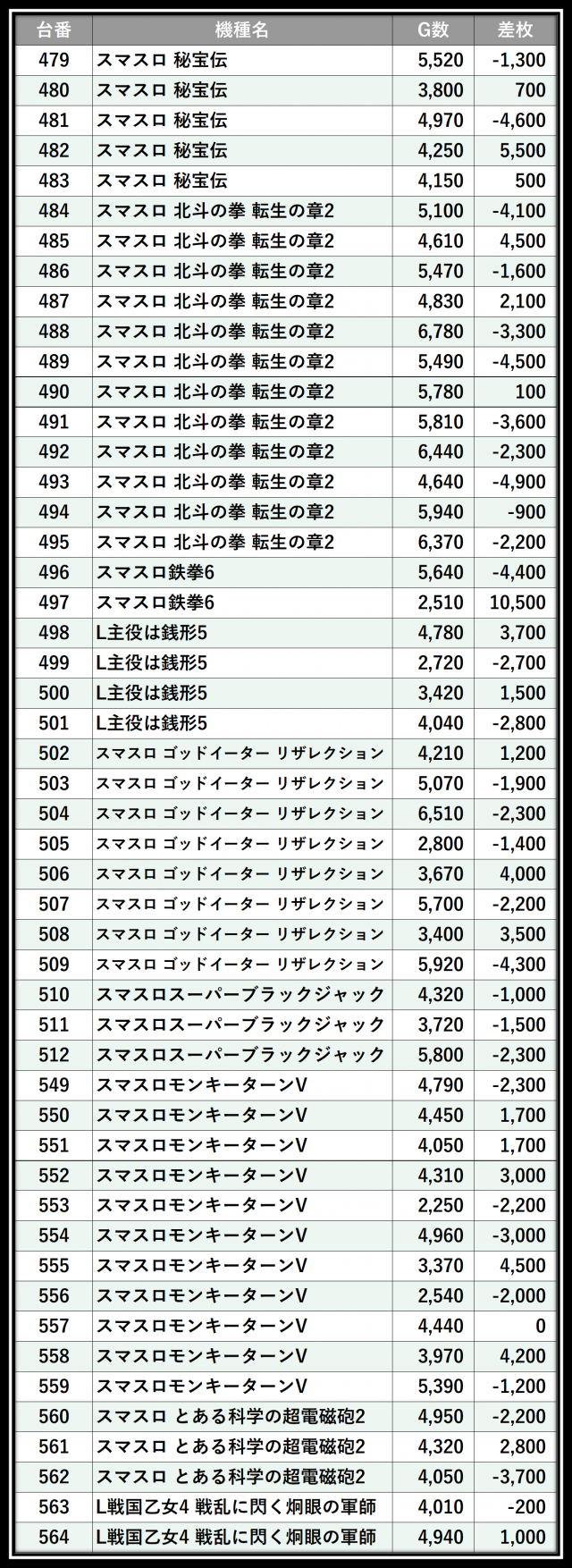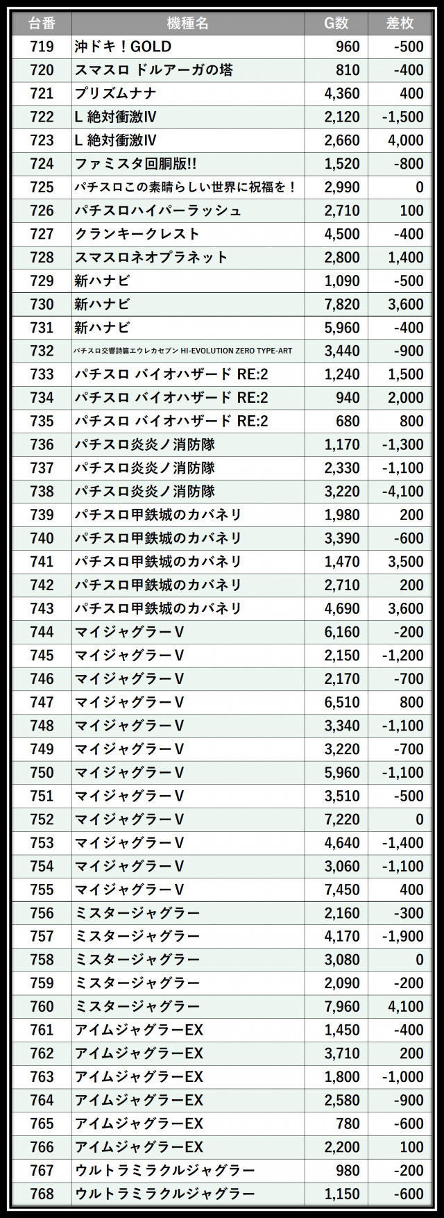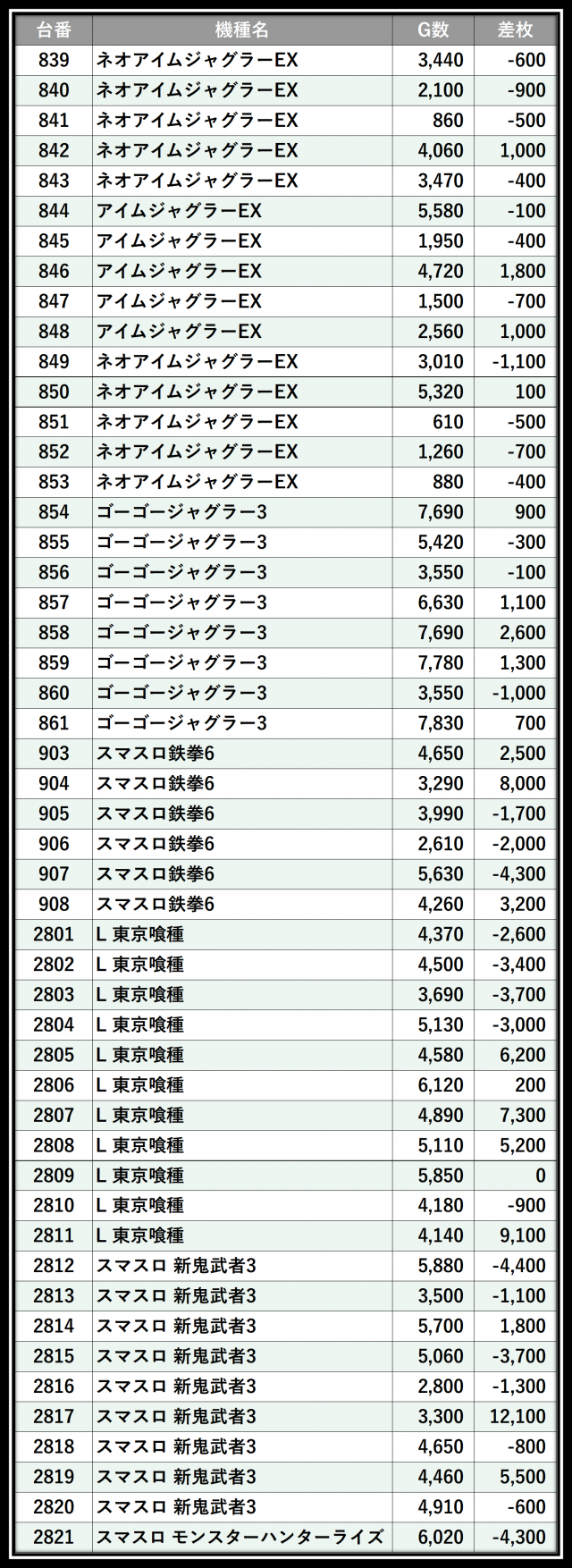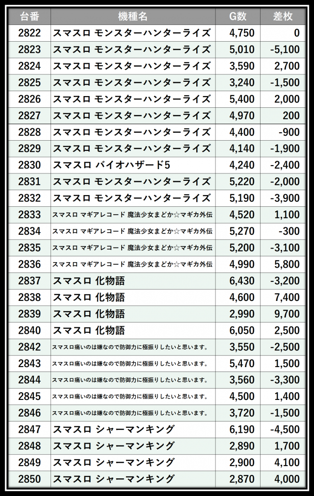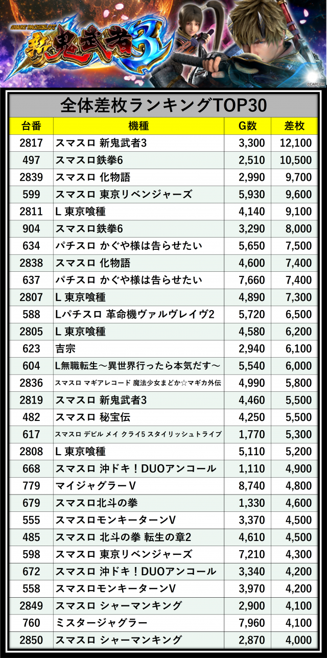 ※差枚数順に掲載しています