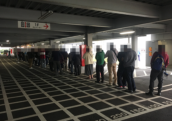 初日である28日の開店前には、140名前後のプレイヤーが集合。遊技の話で盛り上がるなど、開店までの時間を楽しく過ごしている様子であった。