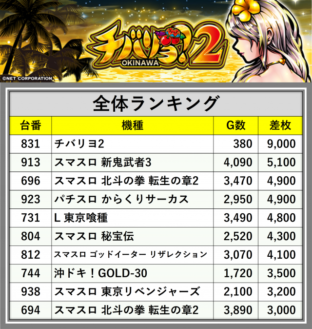 厳選された取材対象機種をはじめ、その他スロット全体から好記録が飛び出した!プレイヤーが楽しんだ1日を下記データにて振り返ってみて欲しい。