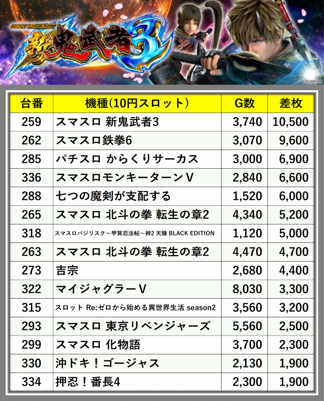 厳選された取材対象機種をはじめ、その他スロット全体から好記録が飛び出した!プレイヤーが楽しんだ1日を下記データにて振り返ってみて欲しい。