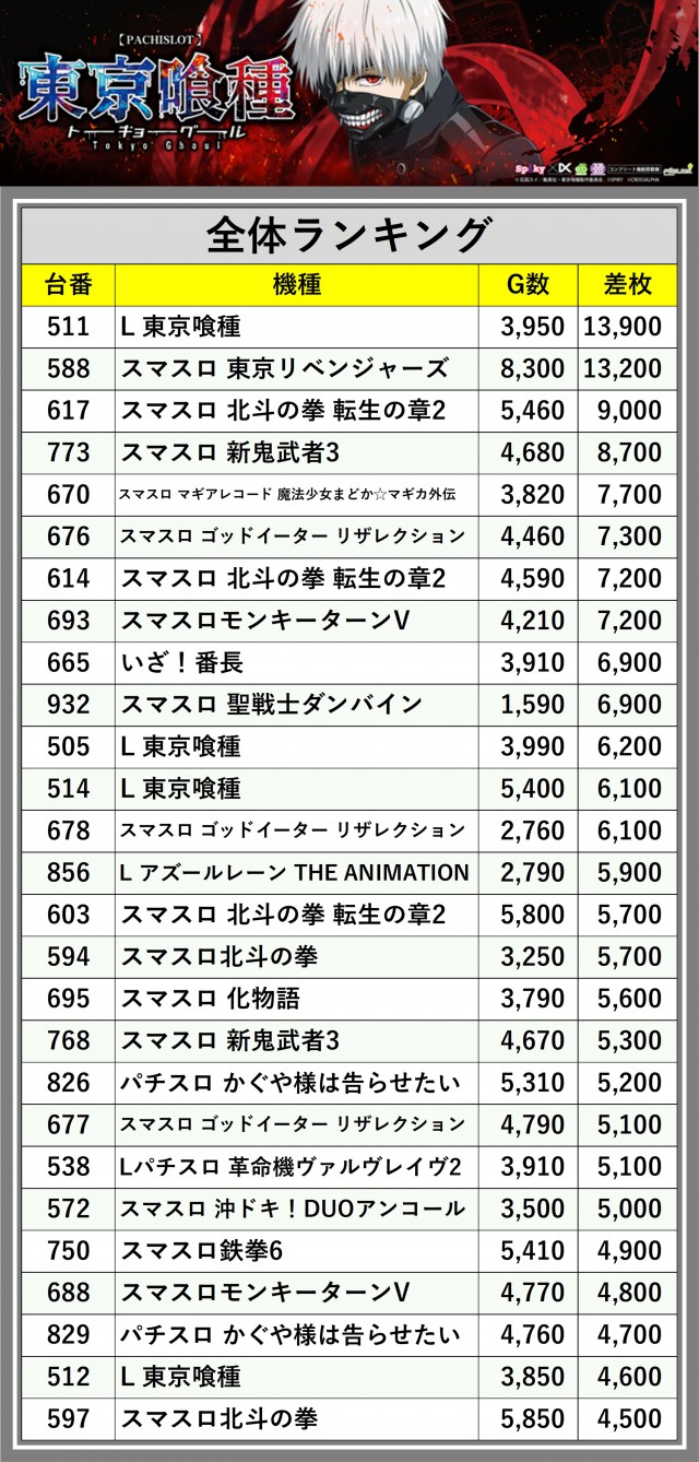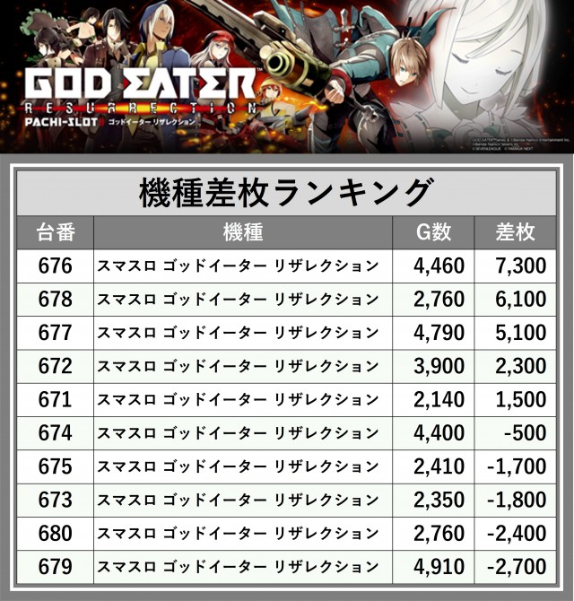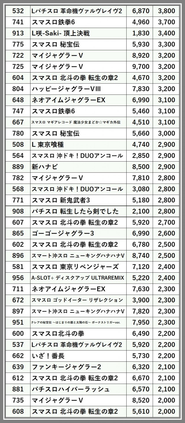 ※差枚数順に掲載しています