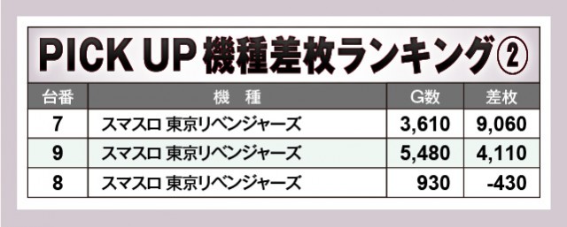 『スマスロ ゴッドイーター リザレクション』にて11,860枚という凄まじい熱気が噴出し、さらに『スマスロ 東京リベンジャーズ』も9,060枚で追随するなど、館内の盛り上がりに包まれていた。『L無職転生~異世界行ったら本気だす~』も大台突破を果たしており、まとまった出玉を確保する台の多さも目立っている。またノーマル機もじっくりと打ち込まれており、右肩上がりのグラフを形成していたのも見逃せないポイントだ。