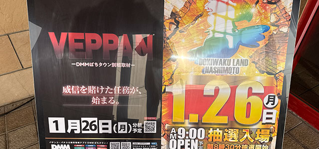 DMMぱちタウン取材班〝別班〟が威信を賭けて執り行う「VEPPAN」が、1月26日に「ドキわくランド橋本店」にて実施された。朝から15人のファンが足を運び、これから起こる盛り上がりを期待して胸を躍らせていたのが印象に残る。同店もまた気概に満ちており、集まってくれた彼らに笑顔を届けたいと意気込んでいた。果たしてどのような1日になったのか…さっそく詳細データとともに店内の様子をお伝えしていこう!