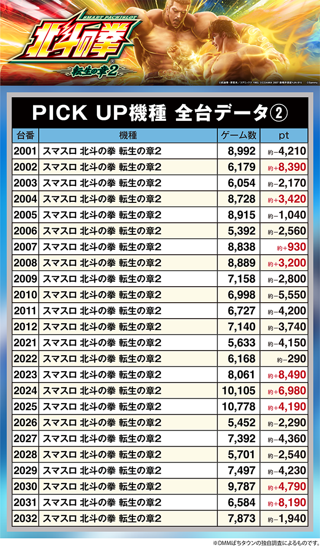 「スマスロ 北斗の拳 転生の章2」では、3台が約+8,100pt超。