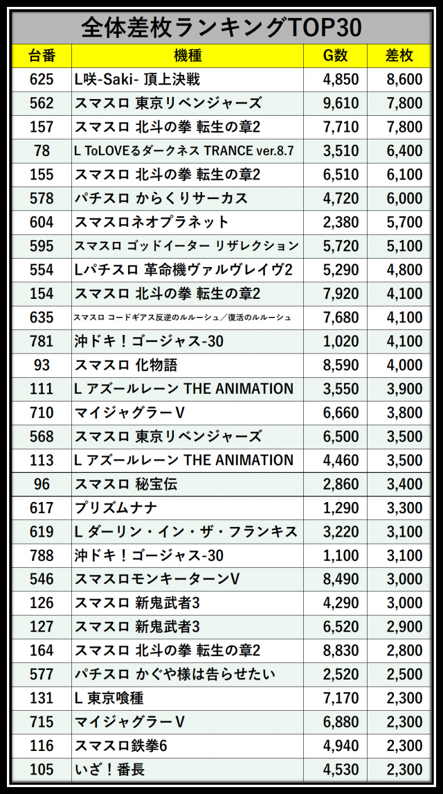 ※差枚数順に掲載しています