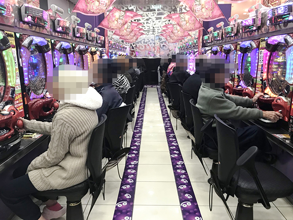 1円パチンコは機種を問わず、全体的に高稼働。特に海物語シリーズは人気が高く、空き台が出るのを待たなければならないほどの状況だった。