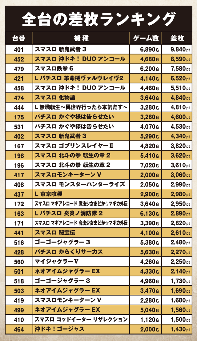 『スマスロ 新鬼武者3』401番台が+9,840ptで首位を奪取。そして『スマスロ 沖ドキ!DUOアンコール』452番台が+8,590pt、『スマスロ鉄拳6』479番台が+7,580ptでつづいている。以下『Lパチスロ 革命機ヴァルヴレイヴ2』421番台の+6,520pt、『スマスロ 沖ドキ!DUOアンコール』458番台の+5,510ptなど、ハイレベルな優秀台がズラリと並ぶランキングが出来あがっていた。