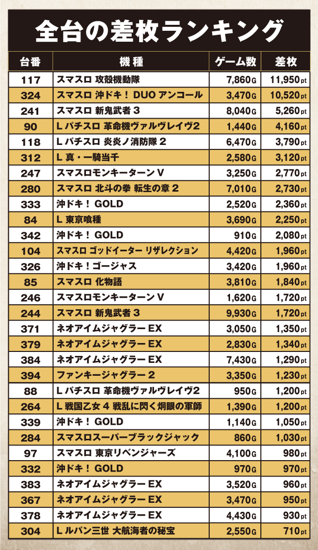 この日は1位を獲得した新台『スマスロ 攻殻機動隊』117番台に加え、『スマスロ 沖ドキ!DUOアンコール』324番台も+10,000pt超えのハイスコアをマーク。3位以下に目を移すと、『スマスロ 新鬼武者3』を始めとしたスマスロ陣だけでなく、『沖ドキ!GOLD』『ネオアイムジャグラーEX』などのメダル機も多数登場するランキングとなった。