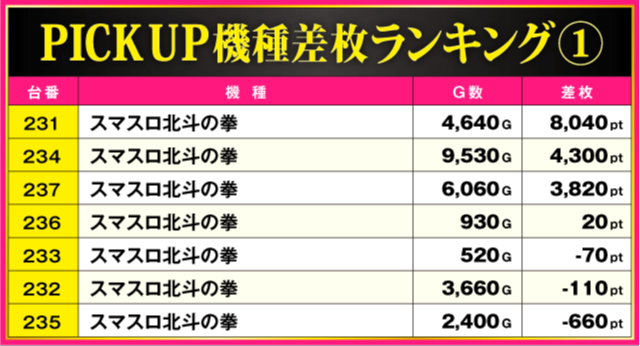今回のPICK UP機種は『スマスロ北斗の拳』で、ハイスコアを記録した台以外からも+4,300ptや+3,820ptといった好成績を確認。最終的に半数以上の台がプラス差枚で実戦を終える見事な結果を残しているだけに、ファンにとっては大満足の一日となったはずだ。