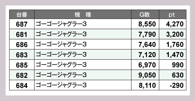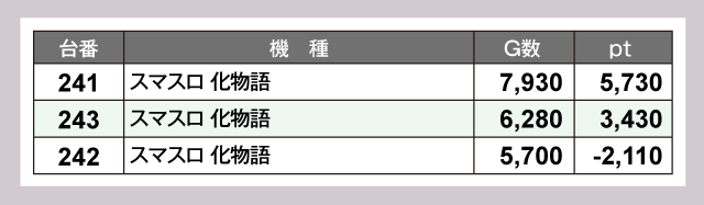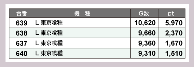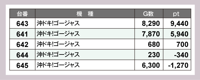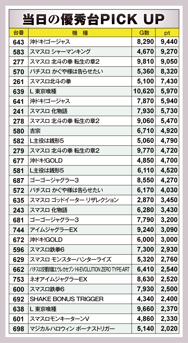 『沖ドキ!ゴージャス』643番台が+9,440ptでデータ最上部を奪取。『スマスロ シャーマンキング』583番台が+9,270pt、『スマスロ 北斗の拳 転生の章2』277番台が+9,050ptでつづいていた。そして『パチスロ かぐや様は告らせたい』570番台が+8,320pt、『スマスロ北斗の拳』261番台が+7,430ptとそれに準ずる好成績で並ぶ。さらに『L 東京喰種』639番台含む5,000ptオーバー4台などなど、目を見張る活躍があちこちで見られる1日だった。