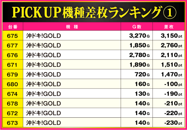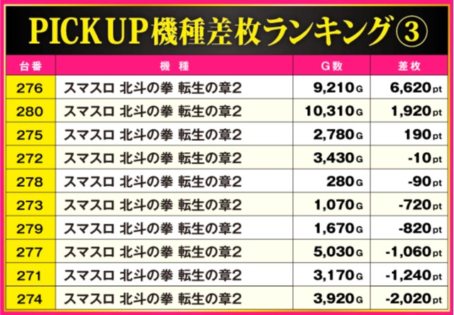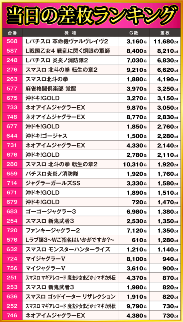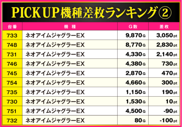 今回のPICK UP機種は全3機種。『沖ドキ!GOLD』からは+3,150ptに+2,000pt超が2台、『スマスロ 北斗の拳 転生の章2』からは+6,620ptが発生。また、Aタイプながら『ネオアイムジャグラーEX』も大奮闘しており、733番台の+3,050ptを筆頭にプラス差枚台が大量発生しファンを喜ばせていた。