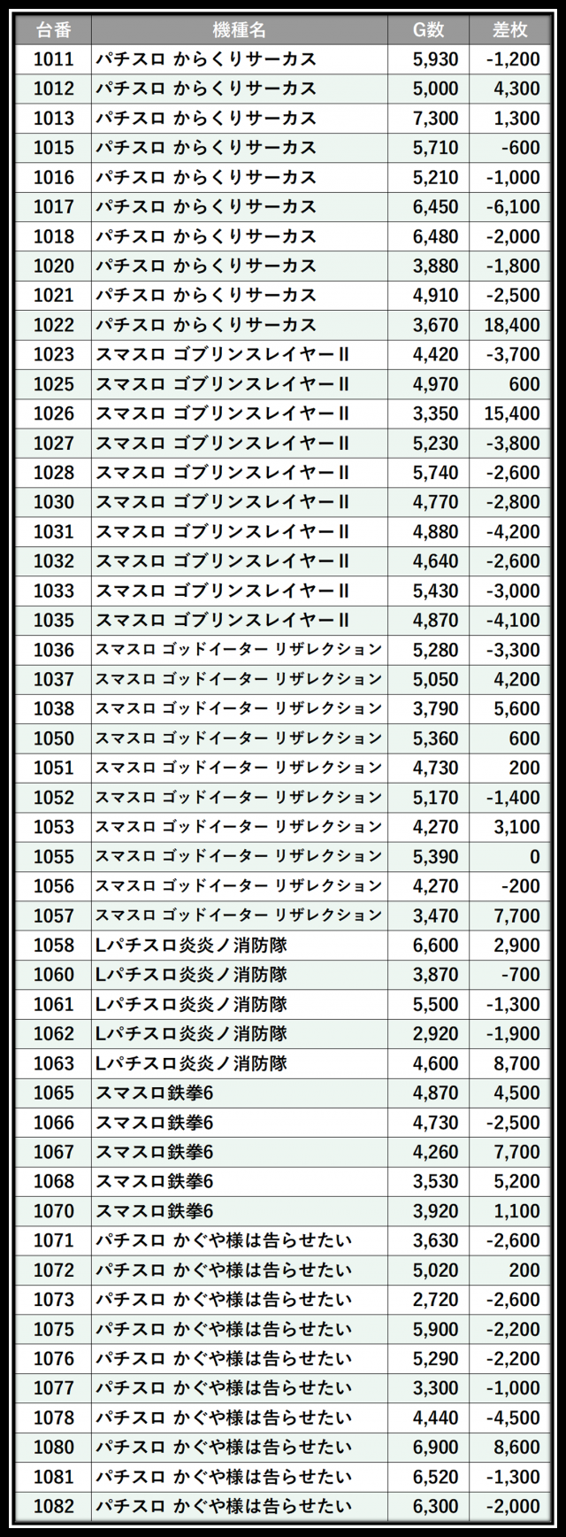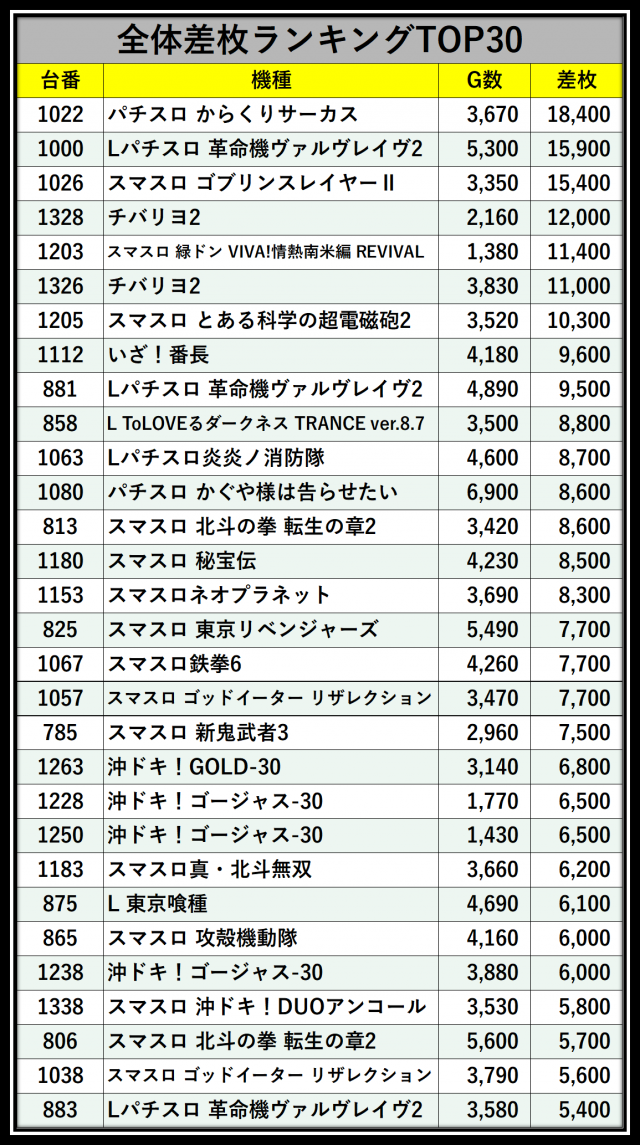 今回の「極誓取材」は、『パチスロ からくりサーカス』が+18,400枚で頂点に立ち、続く『Lパチスロ 革命機ヴァルヴレイヴ2』『スマスロ ゴブリンスレイヤーⅡ』も+15,000枚超を叩き出すなど、圧巻の出玉を披露。さらに『チバリヨ2』が2台ランクイン、『スマスロ 緑ドン VIVA!情熱南米編 REVIVAL』『スマスロ とある科学の超電磁砲2』なども万枚クラスを記録し、AT機を中心に爆発的な展開を見せた。主力どころにとどまらず、多彩な機種が高差枚を残す結果となり、フロア全体にチャンスが広がる1日で極誓の名に相応しい熱量ある開催だったと言えるだろう!
