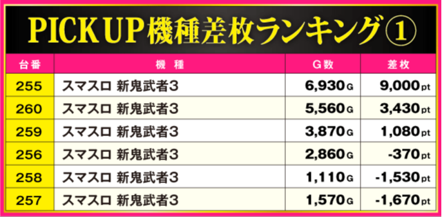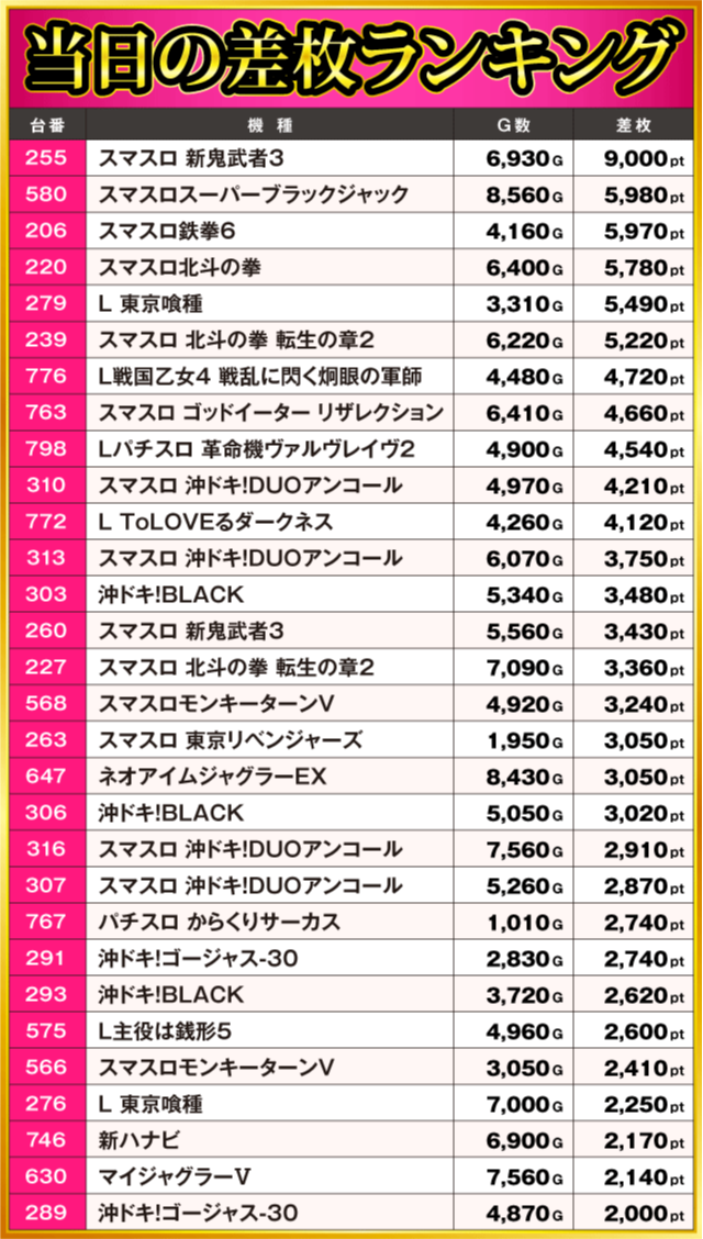 当日の差枚ランキング