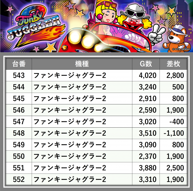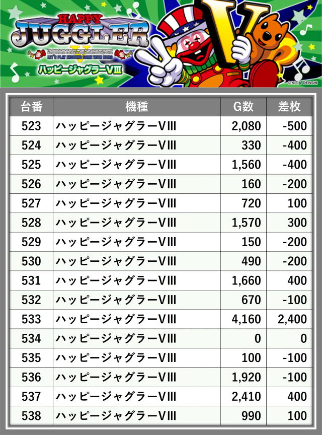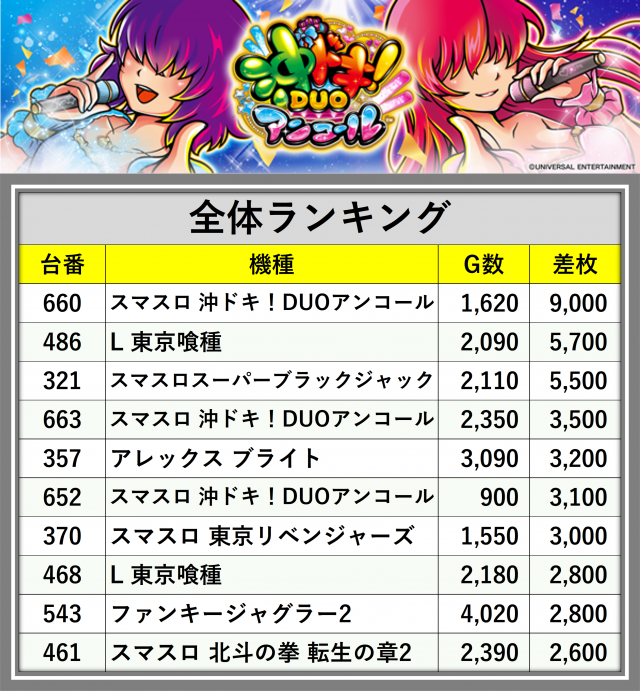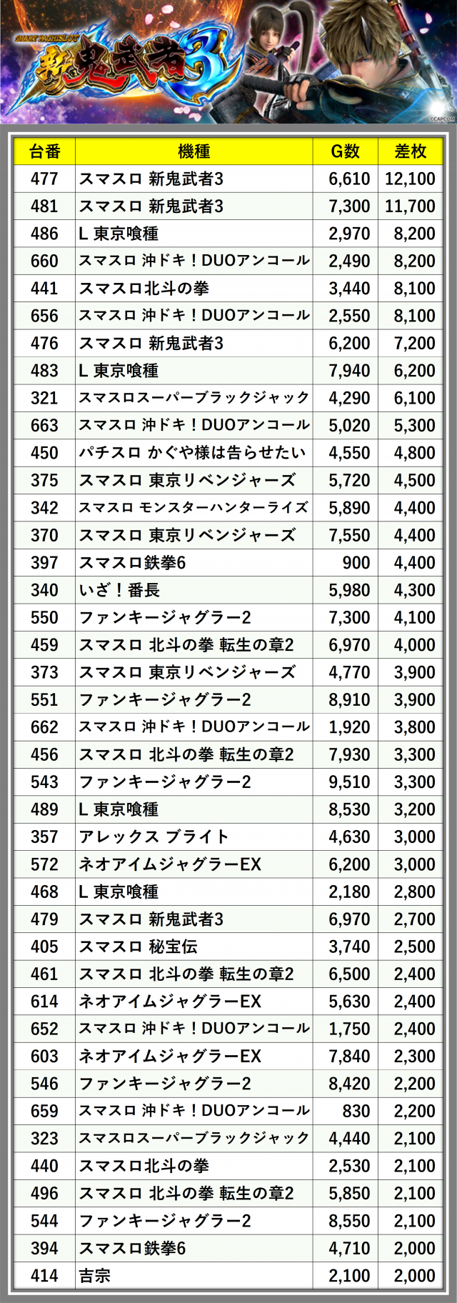 厳選された取材対象機種をはじめ、その他スロット全体から好記録が飛び出した!プレイヤーが楽しんだ1日を下記データにて振り返ってみて欲しい。