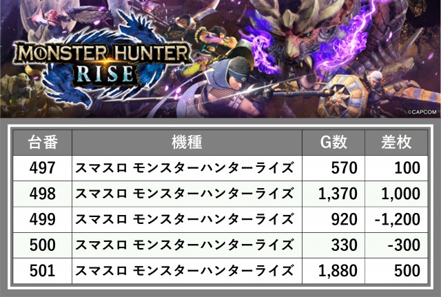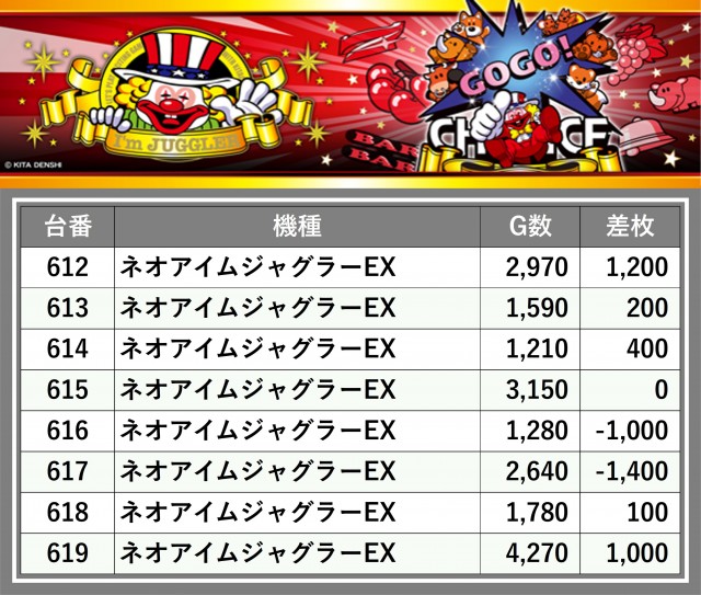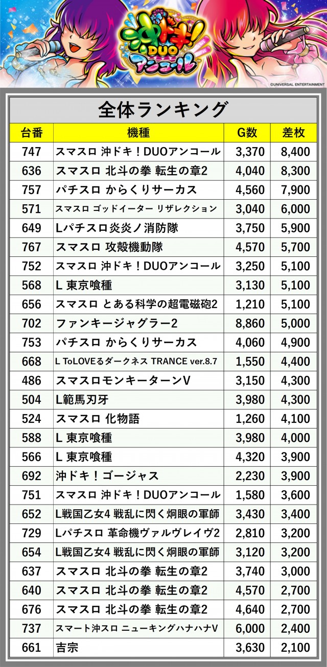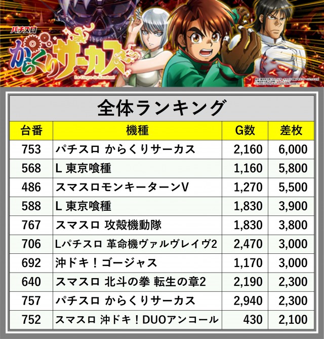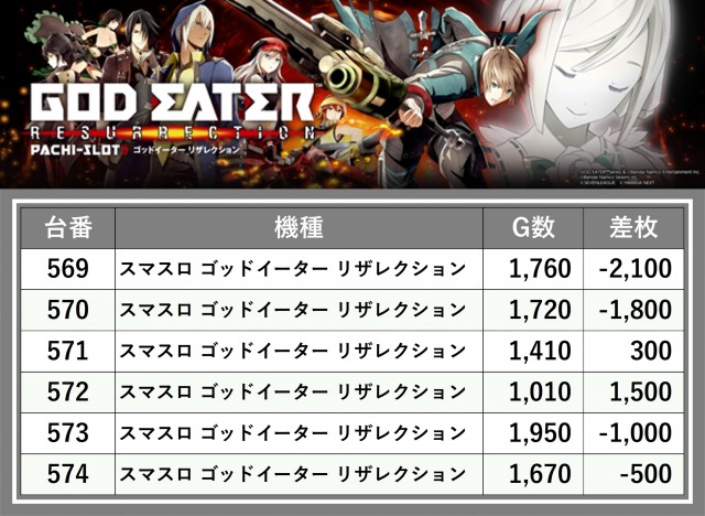 厳選された取材対象機種をはじめ、その他スロット全体から好記録が飛び出した!プレイヤーが楽しんだ1日を下記データにて振り返ってみて欲しい。