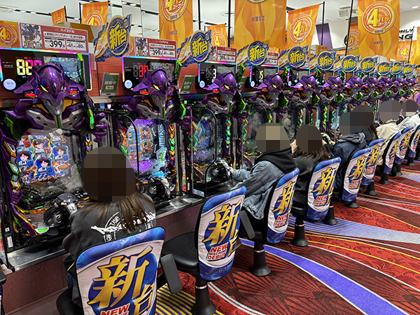 16時半ごろの4円パチンコでは、「e 新世紀エヴァンゲリオン 〜はじまりの記憶〜」や「P ゴジラ対エヴァンゲリオン2 超デカシルバー」などのエヴァシリーズから活気が感じられ、プレイヤーのイキイキとした表情が印象に残っている。