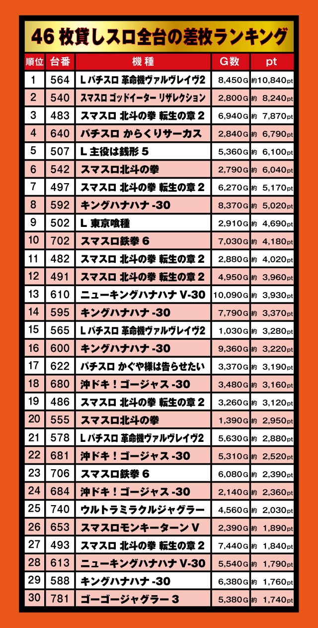 46枚貸しスロ全台の差枚ランキング