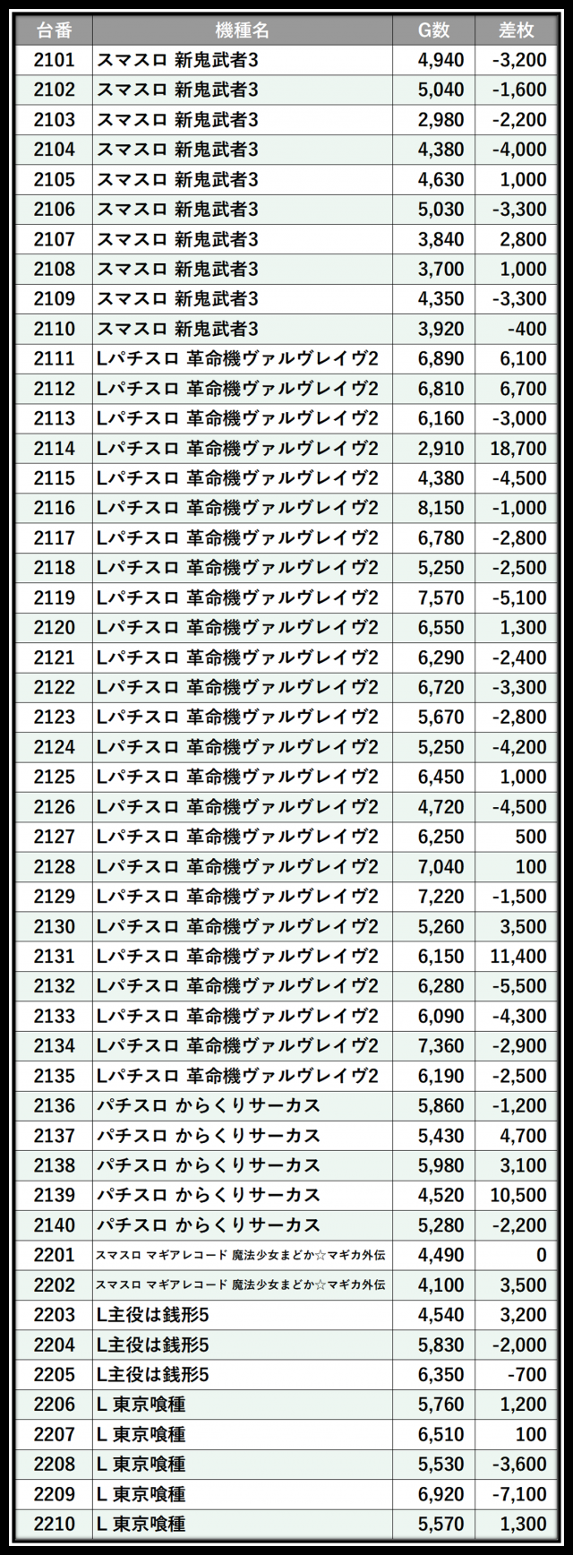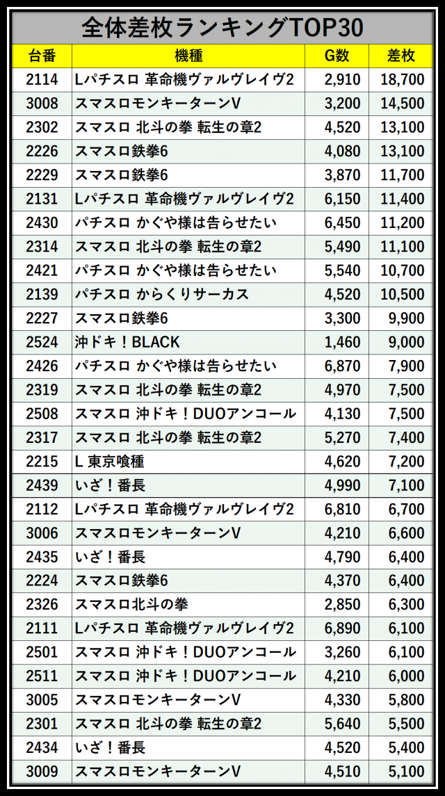 なかでも『Lパチスロ 革命機ヴァルヴレイヴ2』の+18,000枚OVERを筆頭に、王道スマスロ機から万枚OVER台が10台飛び出す圧巻の展開を披露。さらに機種別ランキングをみると、『ファンキージャグラー2』『ネオアイムジャグラーEX』といったノーマルタイプからも4桁プラス台が続出し、スマスロ機だけでなくフロア全体にチャンスが広がっていたことが読み取れる。