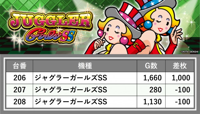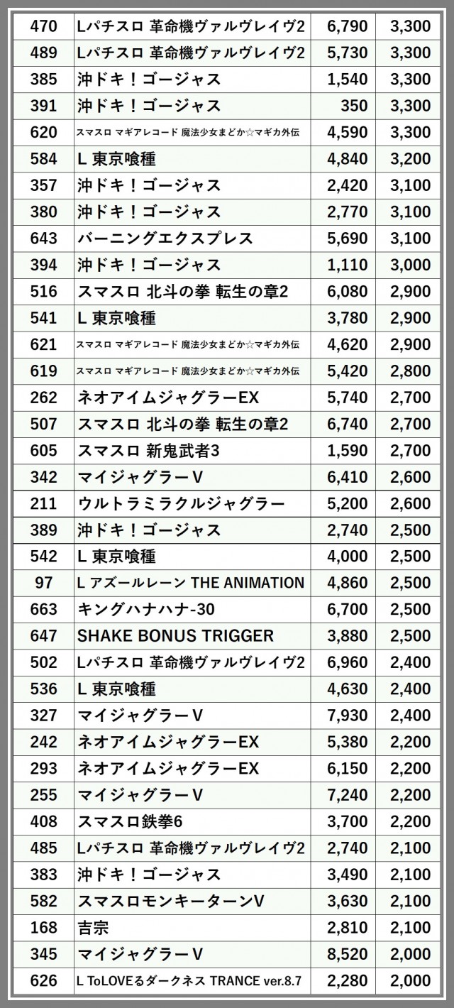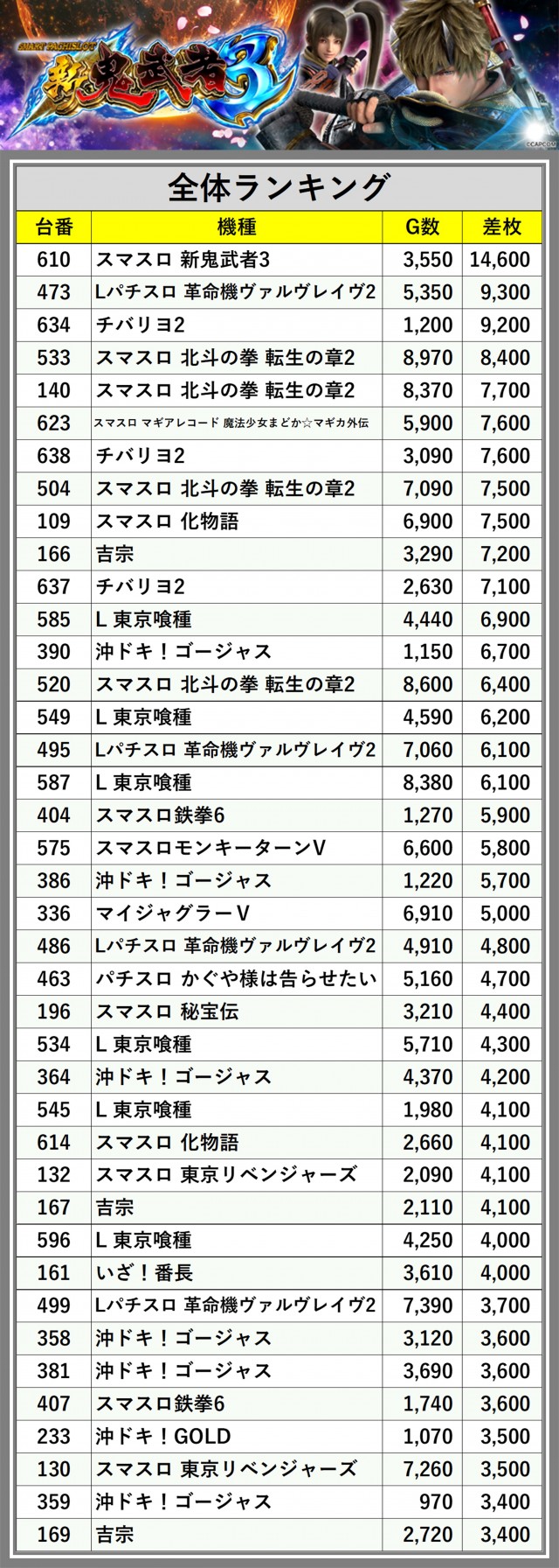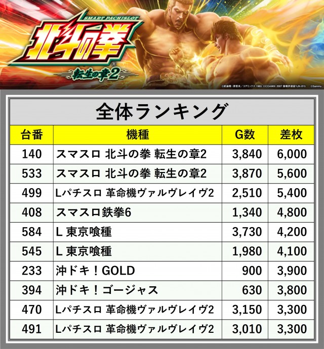厳選された取材対象機種をはじめ、その他スロット全体から好記録が飛び出した!プレイヤーが楽しんだ1日を下記データにて振り返ってみて欲しい。