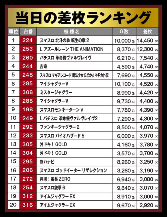 この日のSAPグループはひと味違う。DMMぱちタウンは、「SAP流山」の特別なひとときを一斉取材した。特に華々しい活躍を残した機種たちをピックアップして紹介しよう。まずは差枚ランキングの発表だ!
