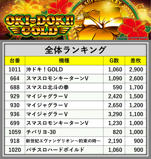 厳選された取材対象機種をはじめ、その他スロット全体から好記録が飛び出した!プレイヤーが楽しんだ1日を下記データにて振り返ってみて欲しい。