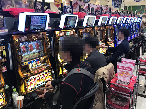 20円パチスロでは、「ミリオンゴッド-神々の凱旋-」がひときわ盛況。機種の性能を上手く引き出しているプレイヤーが注目を集めていた。