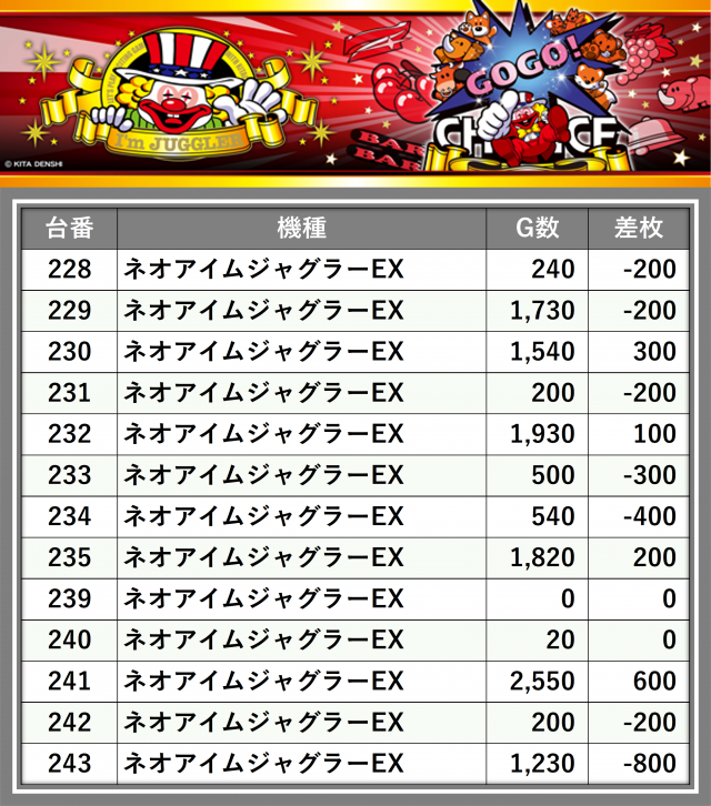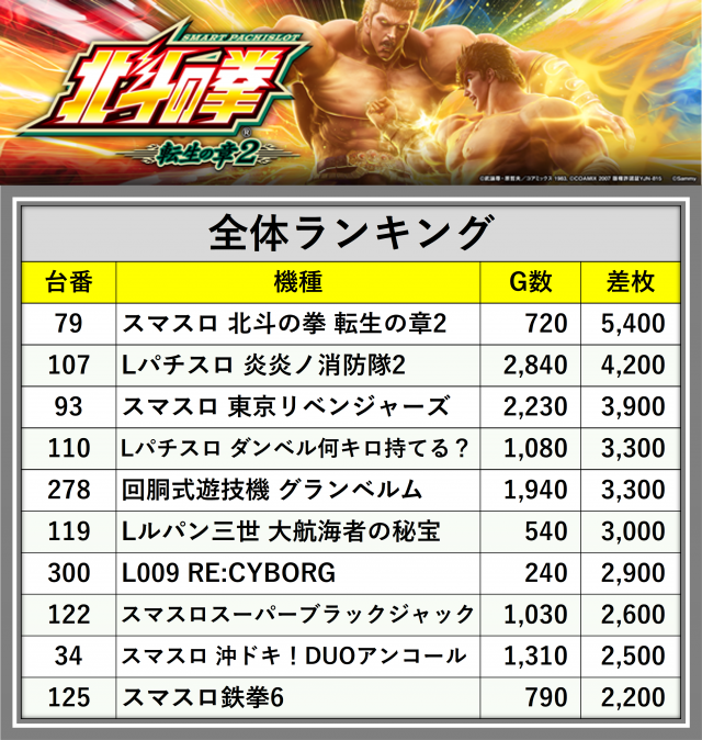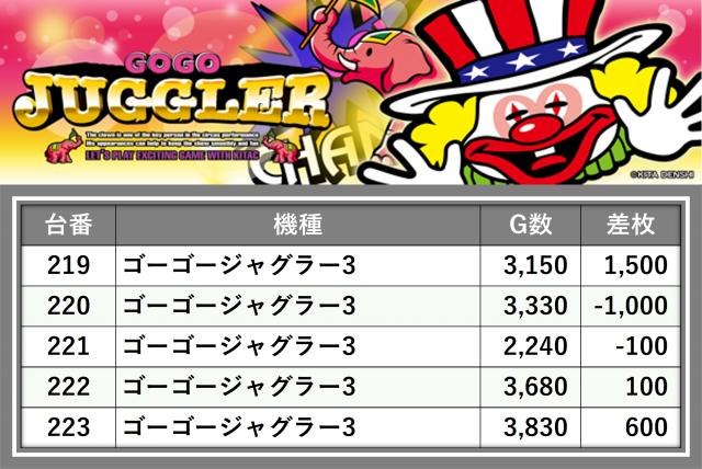 厳選された取材対象機種をはじめ、その他スロット全体から好記録が飛び出した!プレイヤーが楽しんだ1日を下記データにて振り返ってみて欲しい。