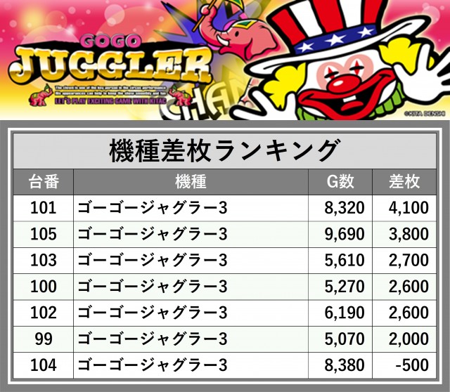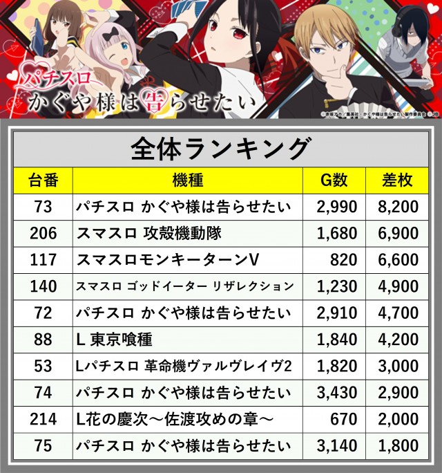 厳選された取材対象機種をはじめ、その他スロット全体から好記録が飛び出した!プレイヤーが楽しんだ1日を下記データにて振り返ってみて欲しい。