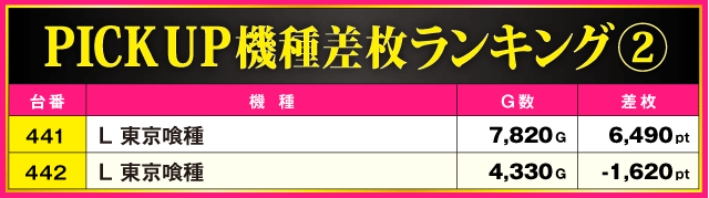 この日は、人気のスマスロを中心にハイスコアが続出。そんな中、『L 東京喰種』が+6,490ptを叩き出しランキングトップに。次いで『Lパチスロ 革命機ヴァルヴレイヴ2』が+5,260ptを記録している。さらに、『Lパチスロ 炎炎ノ消防隊2』から+3,730ptが飛び出すなど、導入直後の新台の活躍も目立っていた。