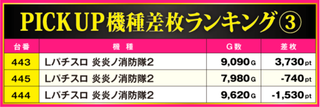 今回のPICK UP機種全3機種。好成績が発生した『L 東京喰種』と『Lパチスロ 炎炎ノ消防隊2』以外に『スマスロ 化物語』からも多数の好調台を確認。500番台の+3,950ptを筆頭に3台全てがプラス差枚となっているだけに、ファンにとって充実の一日となったのは間違いないだろう。