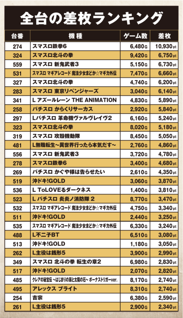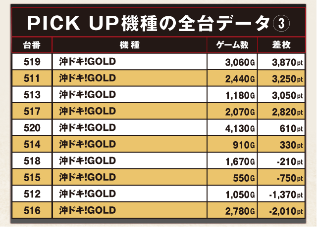 『沖ドキ!GOLD』は+3,000pt超が3台も発生。しかも、全10台中6台がプラス差枚となっているだけに、ファンにとっては大満足の一日となったはずだ。