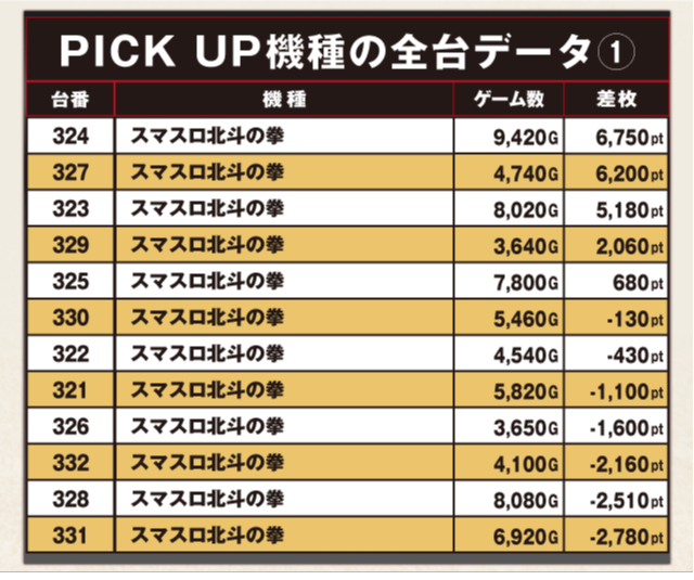 『スマスロ北斗の拳』は+6,000pt超が2台に+5,180ptと好成績が続出。ゲーム数が8,000Gを超えている台も複数確認されており、シマ内は常に活気に満ち溢れていた。