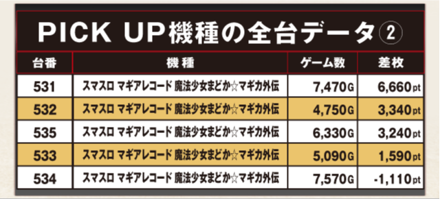 『スマスロ マギアレコード 魔法少女まどか☆マギカ外伝』は、531番台が+6,660ptを記録。さらに、プラス差枚に届かなかったのは全5台中わずか1台のみであった。
