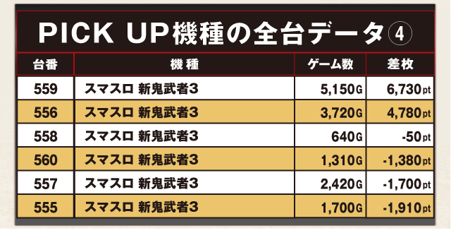 『スマスロ 新鬼武者3』からも複数の好調台を確認。なかでも、559番台から+6,730pt、556番台から+4,780ptが飛び出しプレイヤーの注目を集めていた。