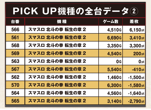 人気シリーズの最新作『スマスロ 北斗の拳 転生の章2』は566番台の+6,150pt以外にも+3,000pt超が2台と好成績を量産しファンを喜ばせていた。