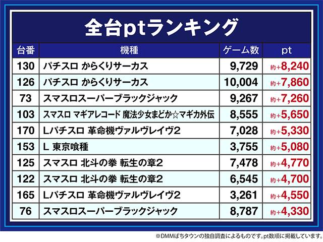 「スマスロスーパーブラックジャック」は2台が約+4,300pt以上で、73番台が約+7,260pt。