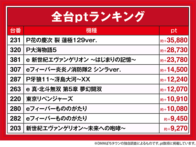 「P大海物語5」の320番台と「e 新世紀エヴァンゲリオン ~はじまりの記憶~」の381番台も約+23,000ptを超えた。
