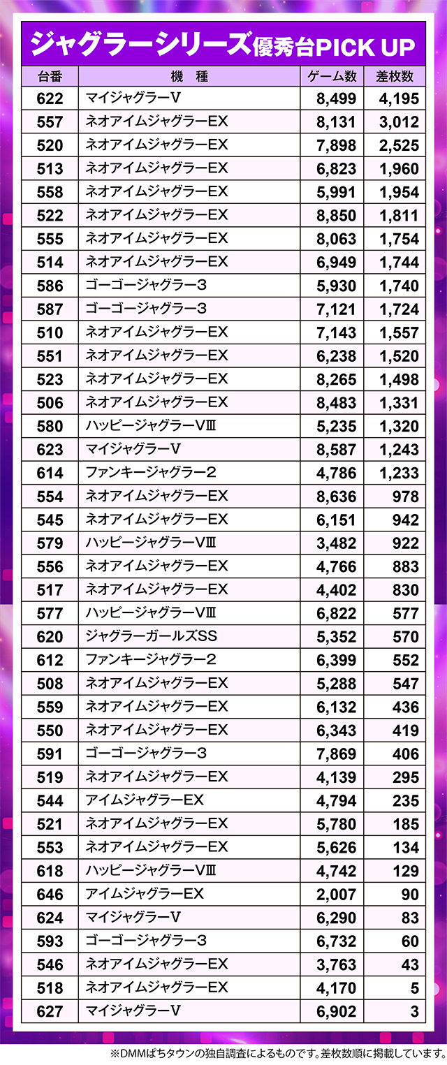 結果を残した台は、「ゴーゴージャグラー3」や「ハッピージャグラーVⅢ」、「アイムジャグラーEX」でも確認。
