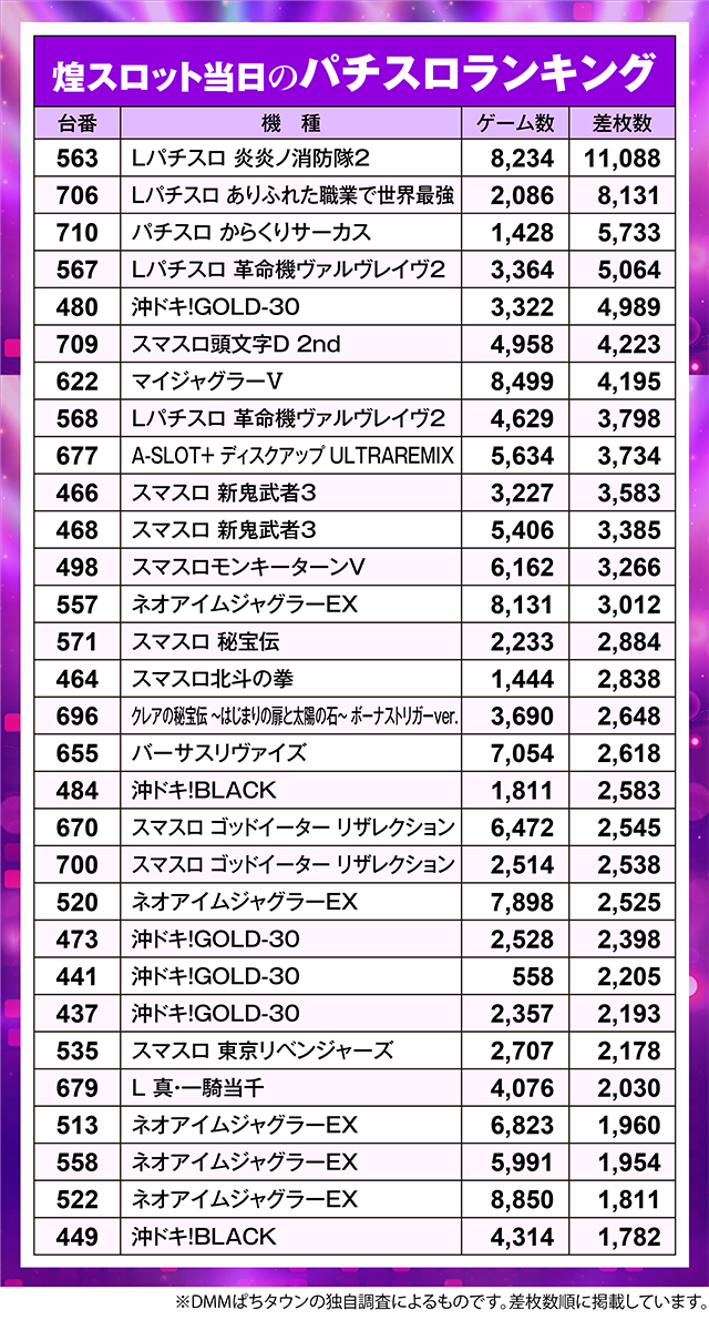 煌スロット当日のスロットランキング